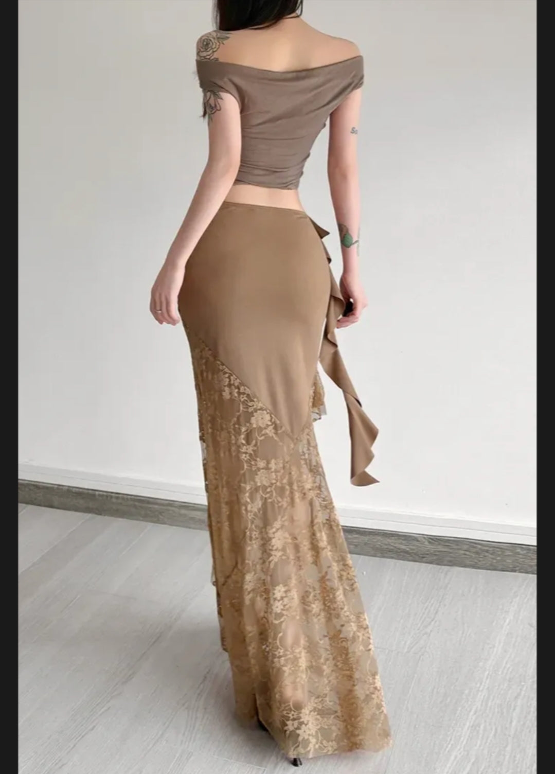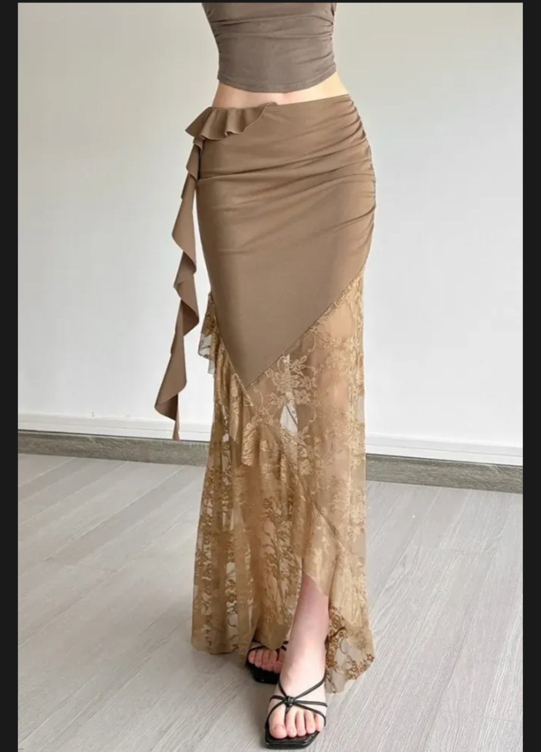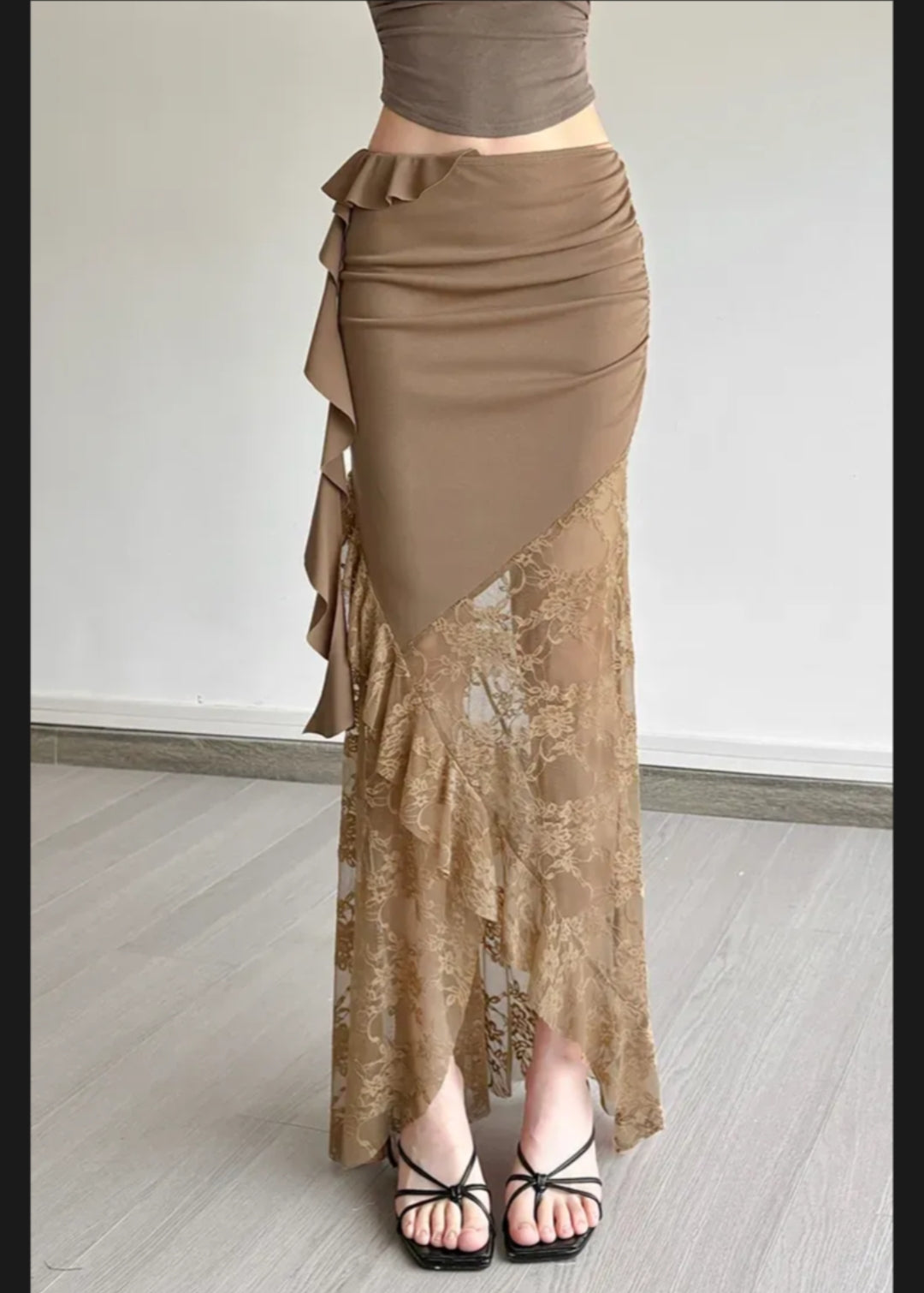 Elevate your style with our Brown Ruffled Wrap maxi skirt. Crafted with a flattering wrap design and ruffle detailing, this skirt offers effortless elegance for any occasion. Made with high-quality fabric, it's comfortable and stylish. Perfect for a day out or a night on the town.